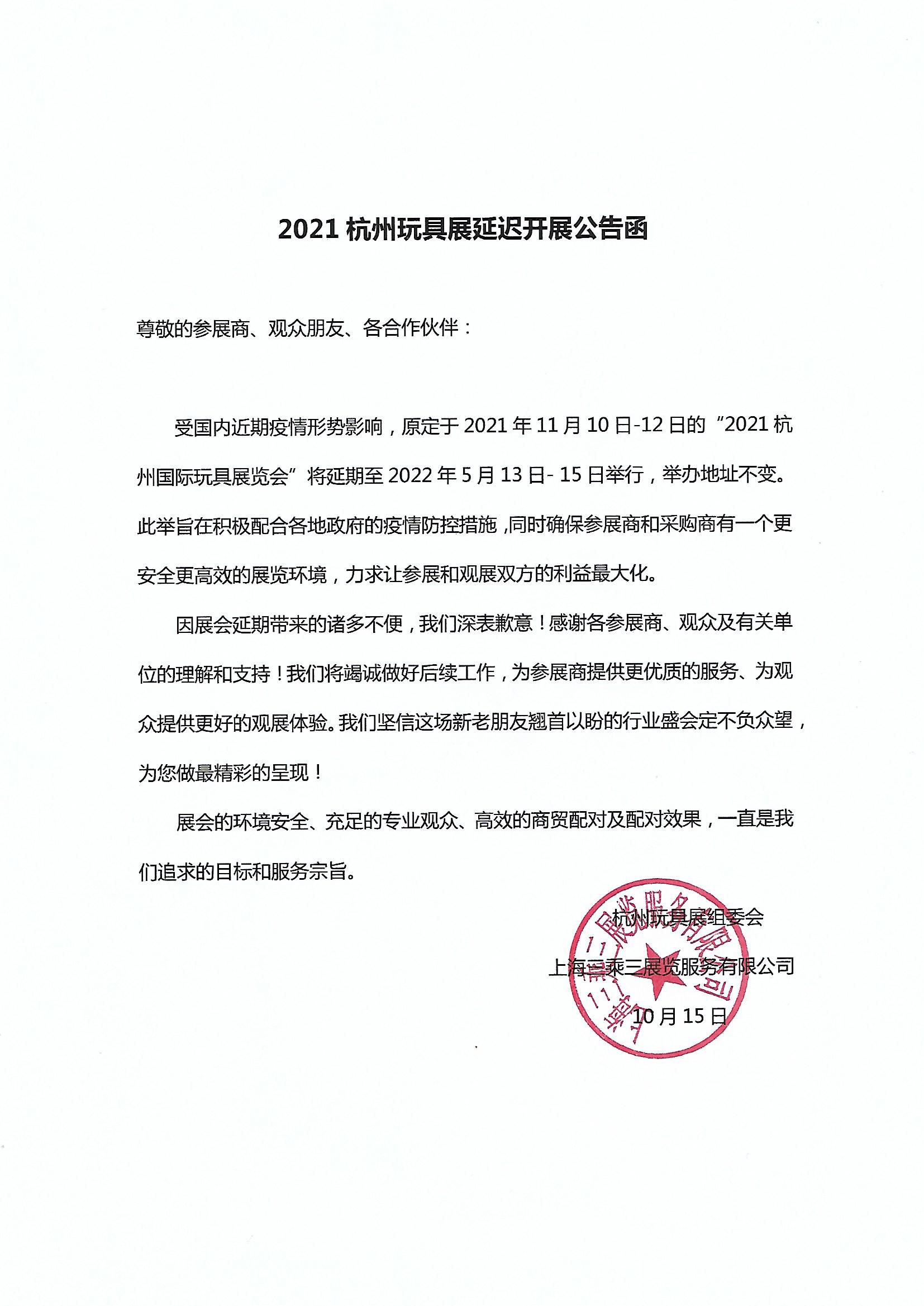 2021杭州玩具展延迟开展公告函