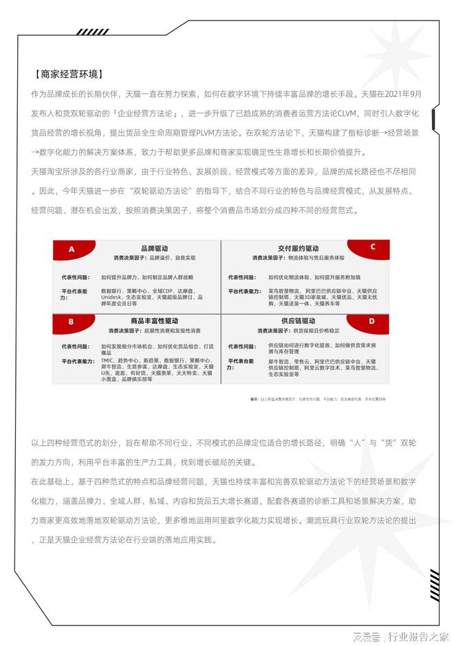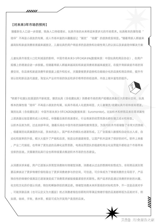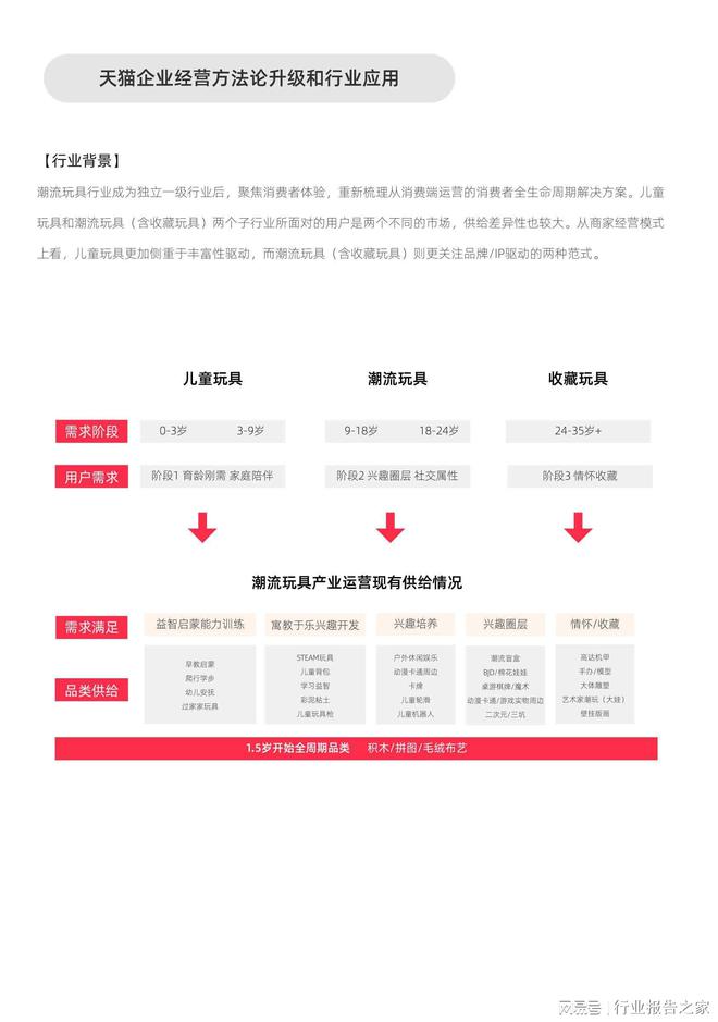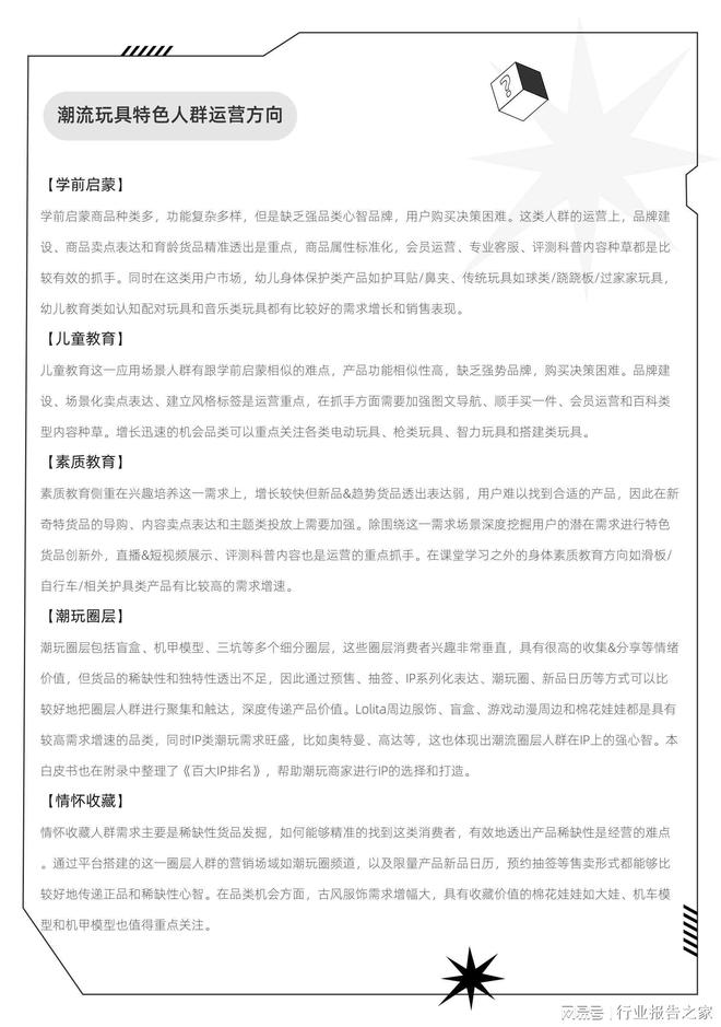 导读:潮流玩具行业成为独立一级行业后,聚焦消费者体验,重新梳理从消费端运营的消费者全生命周期解决方案。儿童玩具和潮流玩具(含收藏玩具)两个子行业所面对的用户是两个不同的市场,供给差异性也较大。从商家经营模式上看,儿童玩具更加侧重于丰富性驱动,而潮流玩具(含收藏玩具)则更关注品牌/IP驱动的两种范式。
