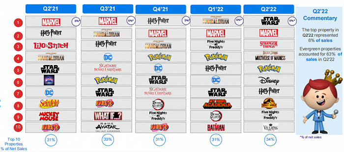 Funko以拥有大量和多样化的IP授权闻名。2022年上半年,Funko活跃IP数量达到851个,其中单个IP净销售额为73.3万美元,同比增长45.9%,反映了创纪录的消费者需求水平。