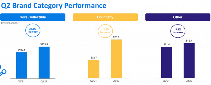 该部门于第二季度卖出7000万美元,延续上一季度的强势,同比增长了114.3%,上半年净销售额为1.2亿美元,同比增长109.6%。财报信息显示,这部分的增长主要是由loungefly品牌所生产背包、钱包等产品的可用性改善所推动。