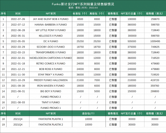 另外,于数字藏品领域,Funko也在不断推出新品。自五月中旬至发稿,Funko共推出了四款NFT新品,相关IP分别为零食品牌家乐氏、动画小马宝莉、动画工作室汉纳-巴伯拉以及电影《白烂贱客》。仅看2022Q2,Funko的三款NFT产品累计发行量116.5万个,共实现销售额232.9万美元。