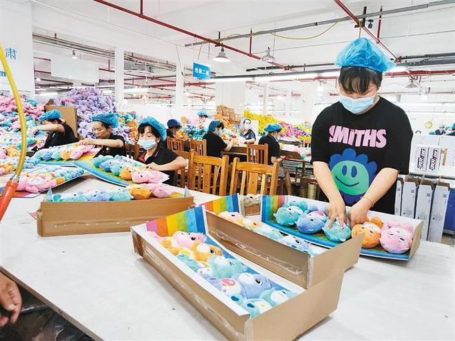 工人对毛绒玩具进行检验包装。